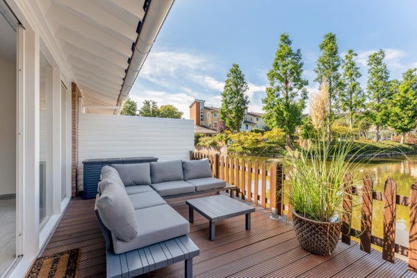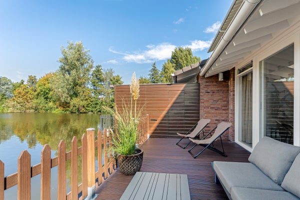 Het verlaagde gedeelte van ca. 37,5 m² geeft door middel van een schuifpui toegang tot het hardhouten terras aan het water gelegen op de zonnige kant.