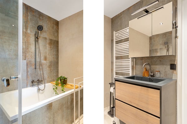 Badkamer is volledig betegeld en voorzien van een bad/ douche, toilet en wastafel.