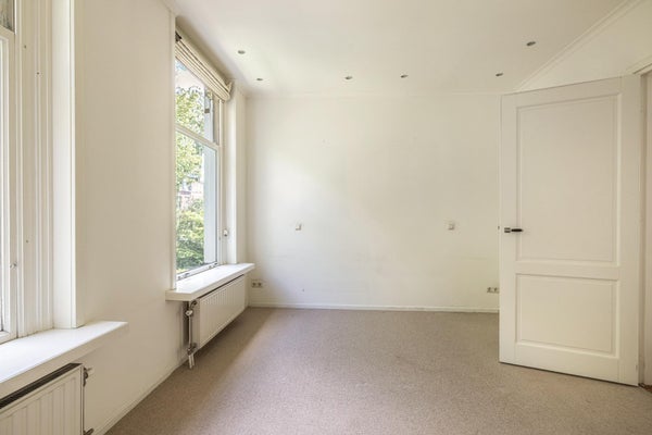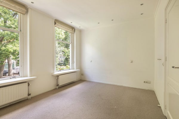 - Ruime woonkamer met plafondhoogte van ca. 3.00 en uitzicht op de groene laan.