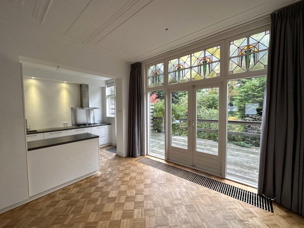 Zeer royale, brede en sfeervolle living ca. 13.30 x 3.85 met hoge originele sierplafonds, openslaande deuren naar veranda en de tuin.