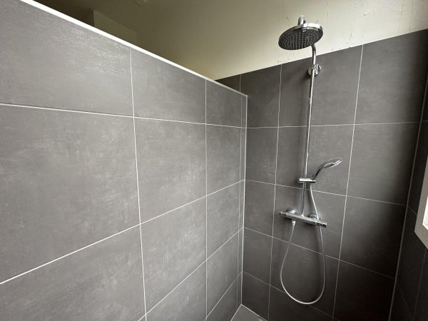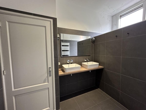 Aan de achterzijde een grote slaapkamer, de badkamer met dubbele wastafel, handdoekenradiator en een inloopdouche.