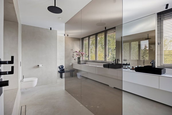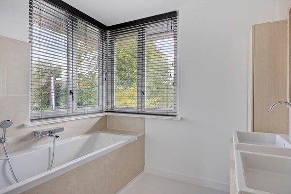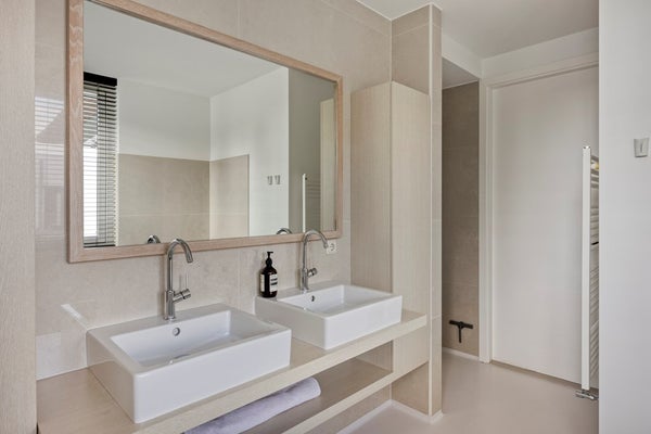 Op deze verdieping bevindt zich tevens de ruime inloopkast, waarvan beide wanden zijn voorzien van op maat gemaakte kasten en een centraal eiland met royale opbergruimte. Een stijlvolle kaptafel maakt het geheel af. Zowel de inloopkast als de slaapkamer sluiten aan op de open badkamer. Het zwevende badkamermeubel biedt veel opbergruimte, zonder afbreuk te doen aan het ruimtelijke gevoel. De vloer vormt een elegant geheel met de regendouche, en de gehele badkamer is afgewerkt met hoogwaardige accessoires van Gessi.