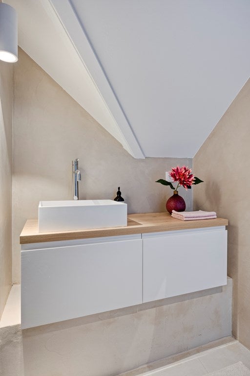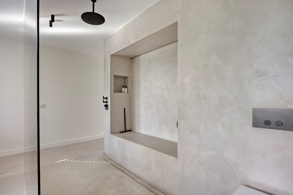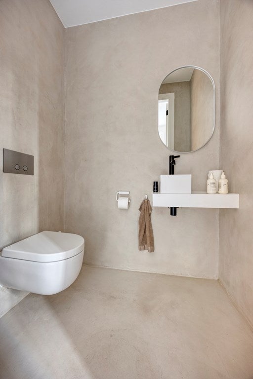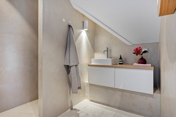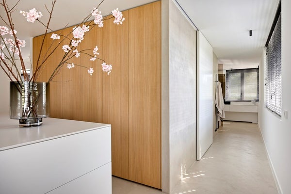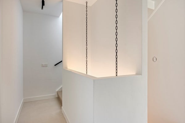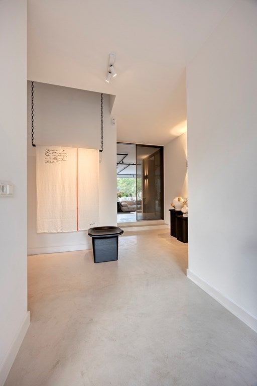 Bij binnenkomst in de ruime hal valt direct de prachtige beton cirévloer op, die door het gehele huis en op alle verdiepingen is doorgevoerd. Deze stijlvolle en tijdloze afwerking heeft een licht karakter, dat door subtiele oneffenheden een levendig en uniek uiterlijk met mediterrane allure krijgt. In de hal komt dit prachtig samen met het interieur. Het iconische Ligne Roset-krukje vormt een smaakvolle combinatie met een hangend doek, dat als kunstzinnig achtergrond is toegepast.
