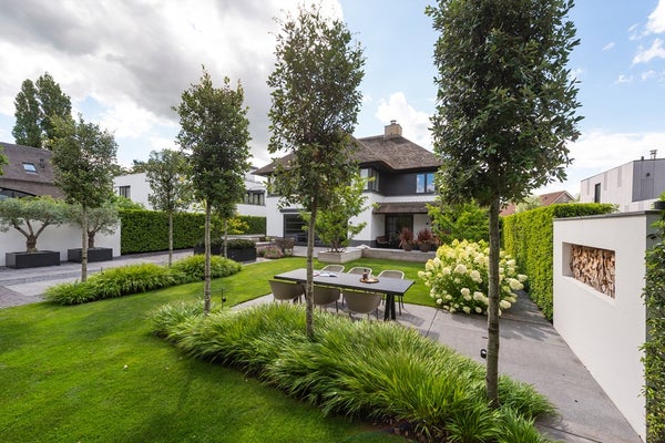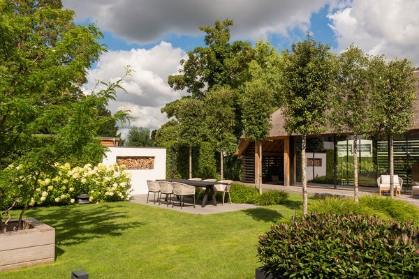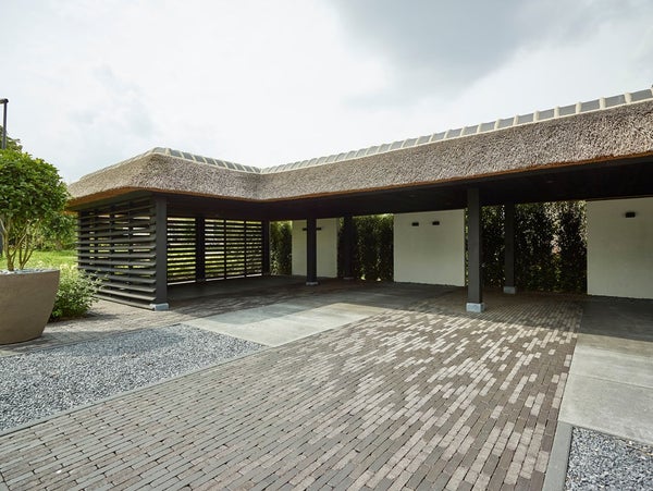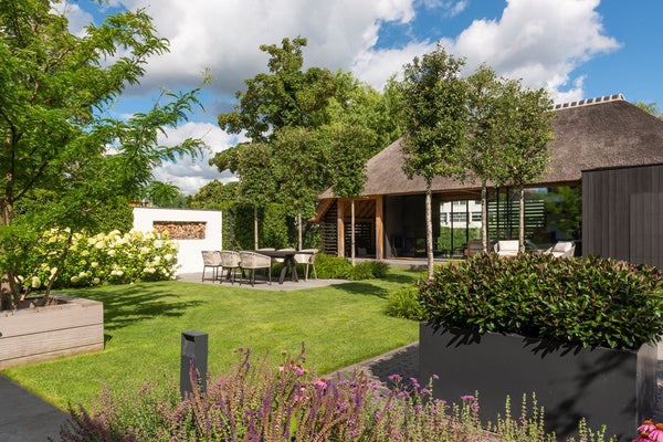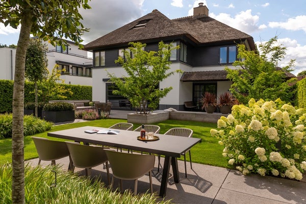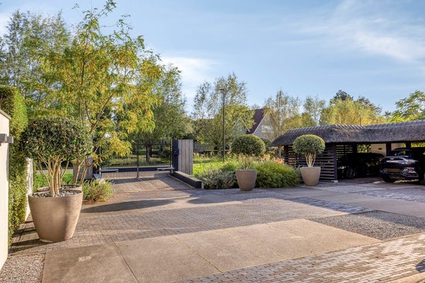 De gehele woning wordt omringd door een fraai aangelegde tuin, ontworpen door de tuinarchitect Teo van Horssen Hoveniers, volledig uitgerust met een irrigatiesysteem voor optimaal onderhoudsgemak en een perfecte integratie van het groen rondom het huis. De voortuin beschikt over een beveiligd en automatisch hek en biedt een stijlvolle carport, uitgevoerd in dezelfde stijl als de woning, met plaats voor drie auto’s, terwijl de betegelde oprijlaan extra parkeergelegenheid creëert.