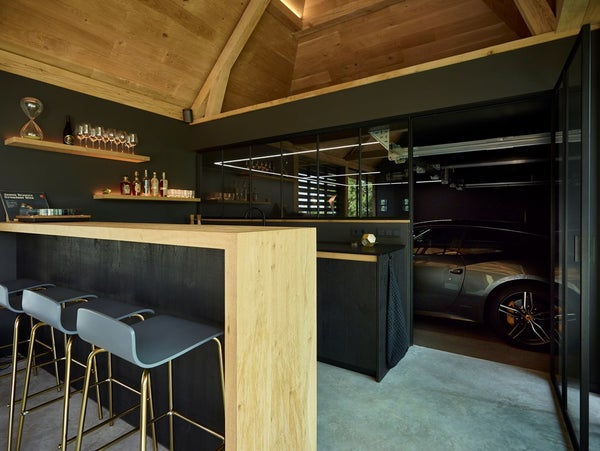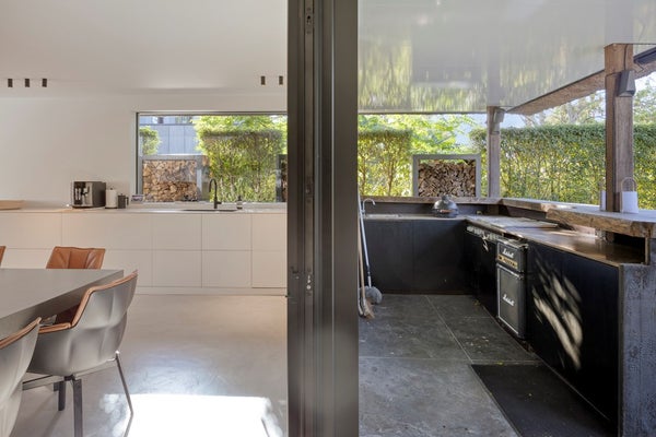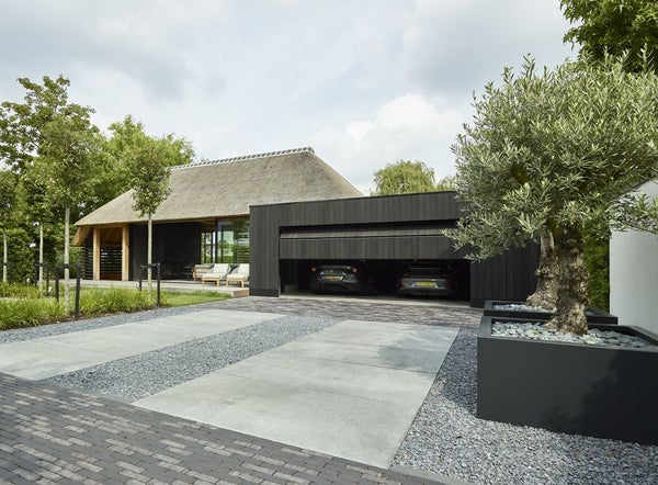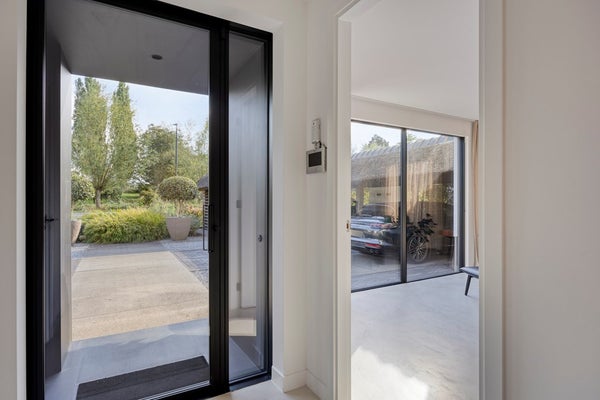 Het buitenhuis biedt ook directe toegang tot de garage van 35 m². Ook hier is plaats voor drie auto’s met extra opbergruimte.