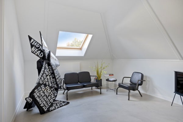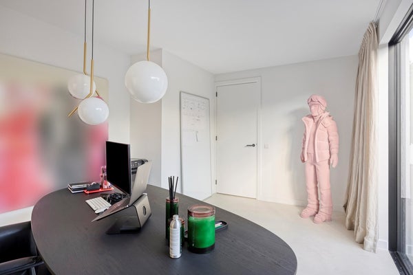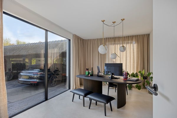 Vanuit de hal heb je toegang tot het stijlvolle kantoor met stoel en krukjes van Carl Hansen & son en een ovale werktafel van Arco en FLOS hanglampen. De grote schuifpui biedt uitzicht op de voortuin, met veel natuurlijk licht.