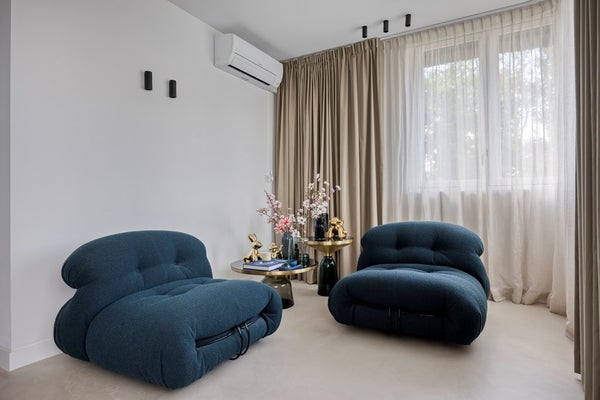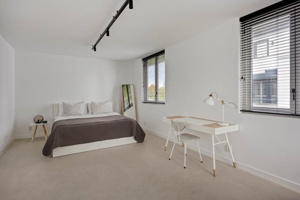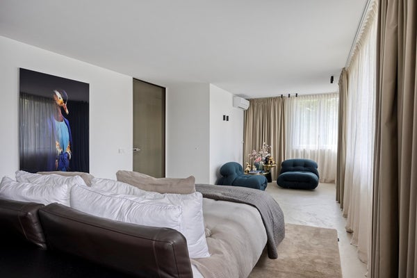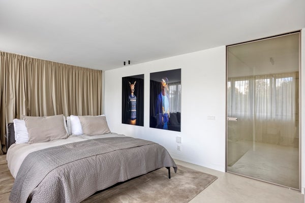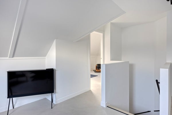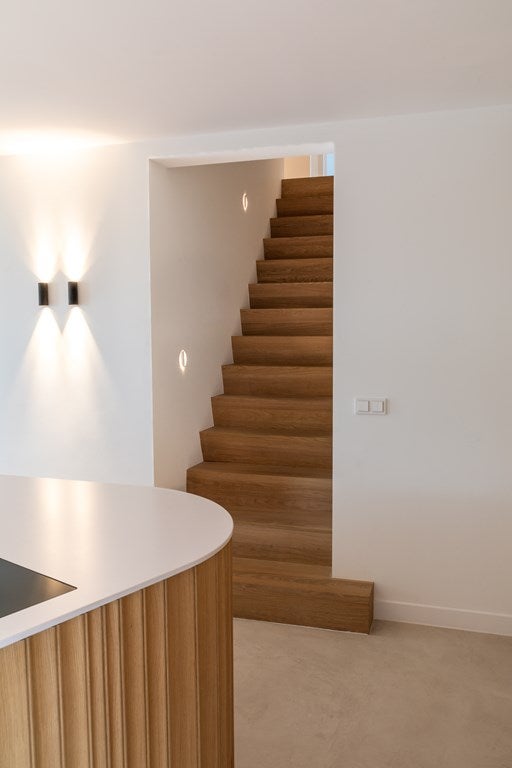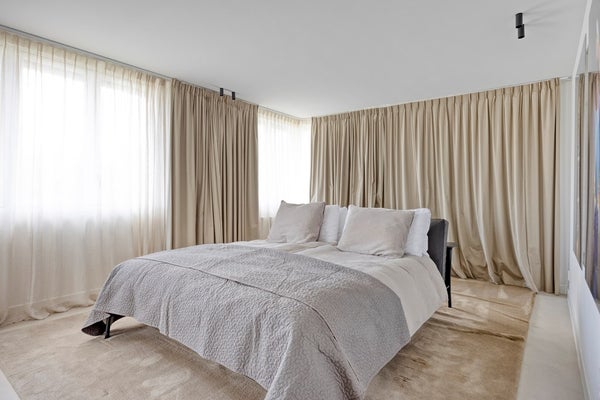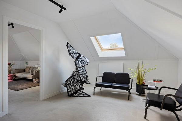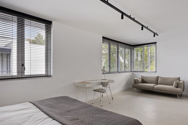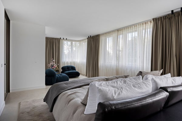 De eikenhouten trap, naadloos afgestemd op de Walderton-panels van de keuken, leidt naar de tweede verdieping van de woning, waar de ruime en luxueuze slaapkamer zich bevindt. Het bed staat centraal in de kamer en wordt omringd door veel daglicht dankzij de grote raampartijen. Het supercomfortabele Sled Bed van Cassina vormt het middelpunt, aangevuld met twee Soriana fauteuils van Cassina. De stijlvolle side tables van Classicon voegen subtiele accenten toe, waardoor de slaapkamer een perfecte balans van elegantie, comfort en karakter uitstraalt.