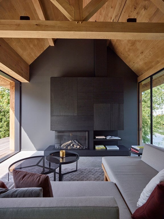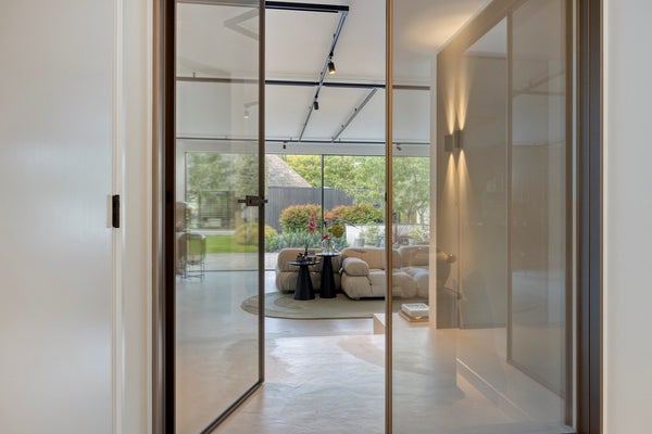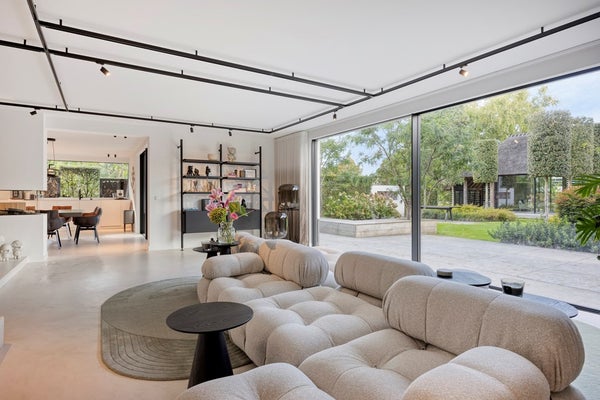 Tussen de hal en de woonkamer is een subtiele verhoging met een trede aangebracht, waardoor de royale oppervlakte een speels en levendig karakter heeft. Centraal in de woonkamer staat de indrukwekkende modulaire bank van B&B Italia, de Camaleonda, die als ware ‘eyecatcher’ direct de aandacht trekt. Ontworpen door Mario Bellini in 1970, straalt deze iconische designbank tijdloze elegantie uit en vormt een prachtig contrast met de stijlvolle beton cirévloer. Dankzij de modulaire opstelling van de bank kun je aan de ene kant genieten van een avond voor de televisie, terwijl je aan de andere kant heerlijk zit met een goed boek. De schuifpuien over de gehele breedte bieden een prachtig uitzicht over de tuin. De organische karpetten verzachten het karakter van de bank.