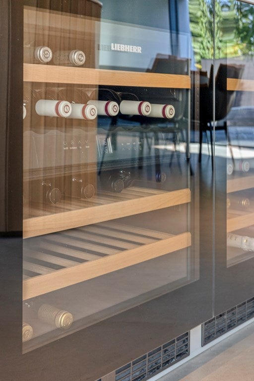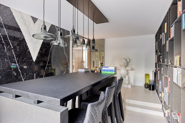Vanuit de woonkamer loop je zo de bibliotheek binnen. Over de gehele lengte is de ruimte voorzien van een op maat gemaakte wandkast, die niet alleen veel opbergruimte biedt, maar ook de mogelijkheid om persoonlijke spullen op een stijlvolle manier te tonen. Dankzij de lange, royale tafel kan de bibliotheek eenvoudig worden omgetoverd tot een elegante bar, waar je gasten in een gezellige sfeer kunt ontvangen.