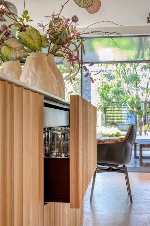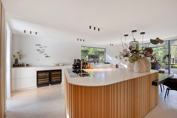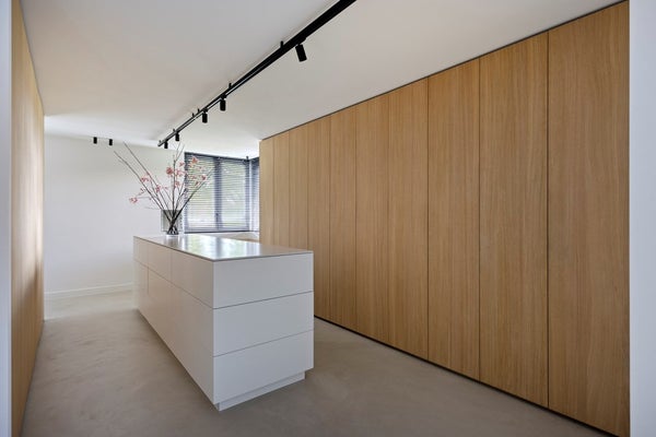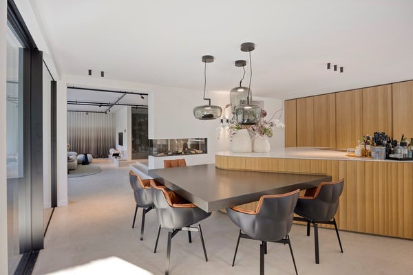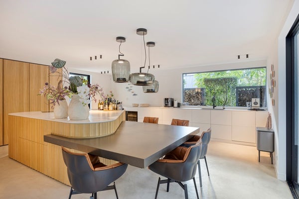Het hart van de woning wordt gevormd door de keuken, volledig vernieuwd en uitgerust met hoogwaardige apparatuur van Siemens, wijnkoelkasten van Liebherr en een stijlvolle ombouw. De keuken beschikt over een inductiekookplaat met 8 inductiekookpitten van Bora, terwijl achter de gewelfde eikenhouten Walderton-panels de 2 ovens , koelkast, vriezer en opbergruimte fraai zijn weggewerkt. Deze prachtige panels komen opnieuw terug rondom het organische en op maat gemaakte keukeneiland, dat het centrale punt van de ruimte vormt. Aan dit eiland is een ruime, zelf ontworpen eettafel geplaatst gecombineerd met de Husk eetkamerstoelen van B&B Italia. De sfeervolle double-verlichting van Brokis boven de tafel maakt het geheel af en creëert een luxueuze en uitnodigende ambiance, perfect voor diners en gezellige momenten met gasten.