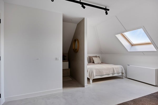 Op de tweede verdieping bevindt zich ook de tweede slaapkamer, uitgerust met een comfortabel tweepersoonsbed en een ruime kast. De kamer beschikt bovendien over een eigen toilet en badkamer, voorzien van een regendouche, ligbad en een royaal badkamermeubel. Deze ruimte is ideaal voor kinderen of als gastenverblijf, waarbij comfort en privacy volledig gewaarborgd zijn.