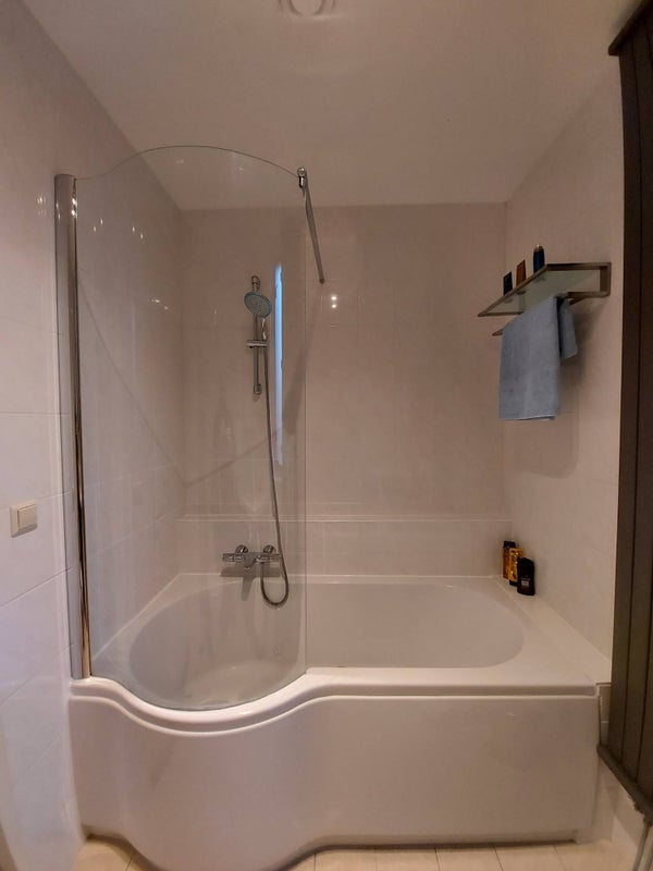 De badkamer is voorzien van ligbad met douche (spatscherm), staand closet en wastafelmeubel met spiegel. Verder afgewerkt met brede wandtegel en vloertegels.