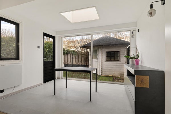 Het huis biedt een doordachte indeling verspreid over meerdere niveaus. De begane grond beschikt over een lichte woon- en eetruimte met directe toegang tot de tuin. De moderne keuken is een echt hoogtepunt, compleet met een kookeiland en bar zitgedeelte—perfect voor casual dineren of entertainen. Boven zijn er vier slaapkamers, wat flexibiliteit biedt voor slapen, thuiswerken of gasten gebruik. Er zijn twee badkamers, die extra comfort en gemak bieden voor het dagelijks leven. De tuin heeft een schuur, ideaal voor het opslaan van fietsen of tuinmaterialen.
