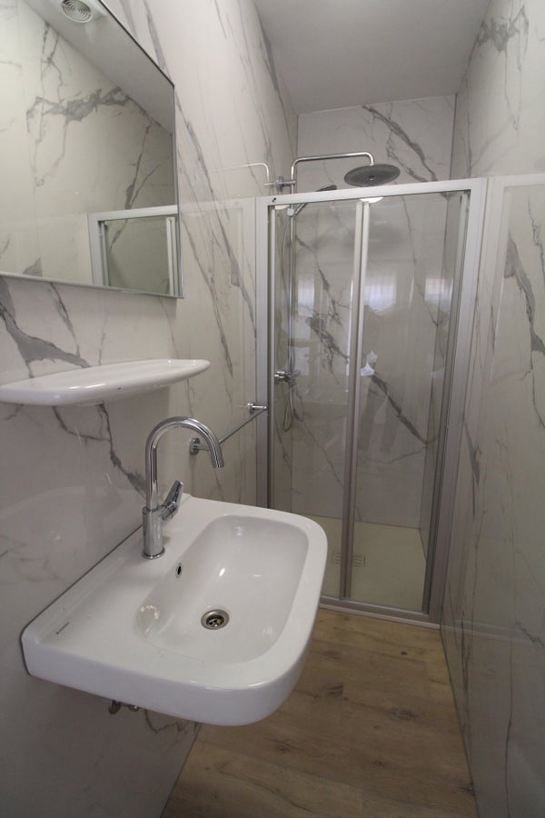 De woning beschikt over twee slaapkamers van circa 10 m² en 15 m². De badkamer is praktisch ingericht met een douche en wastafel. Daarnaast is er een separaat toilet aanwezig.