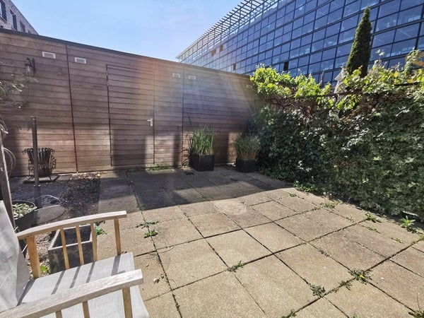 Deze achtertuin heeft ook een grote berging voor je fiets(en) en een achterdeur.