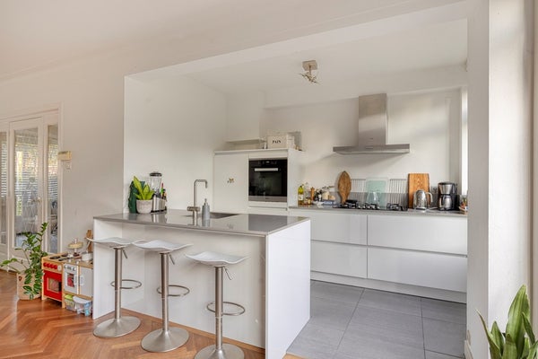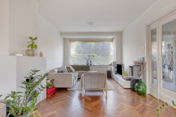 Wanneer je de woning binnenstapt, kom je in de hal waar een apart toilet is gelegen. Via de glazen tussendeur loop je de ruime en lichte woonkamer in, volledig voorzien van een stijlvolle houten visgraatvloer. Aan de voorzijde bevindt zich de zithoek met fraai uitzicht op de voortuin.