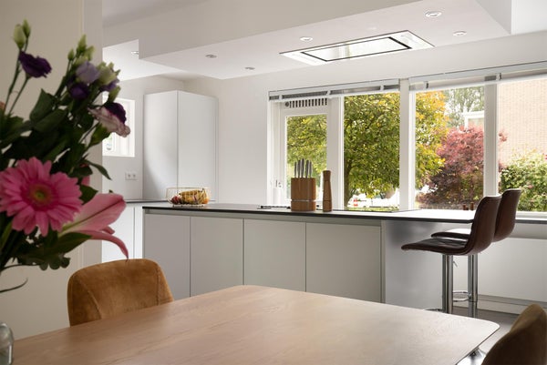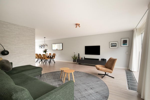 De grote U-vormige living is ca.55 m² met schuifpui naar de achtertuin. In de living bevindt zich een open keuken met kookeiland, voorzien van alle apparatuur. In de woonkamer is ook een kast met deur gesitueerd onder de trap, die dienstdoet als voorraadkast. Ook is er een apart kantoor/speelkamer aangrenzend aan de living met uitzicht op de tuin.