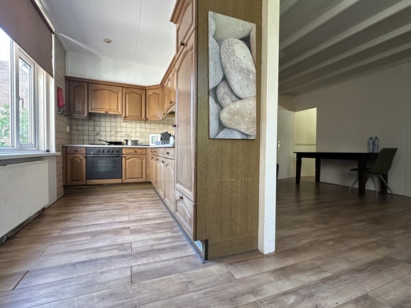 De lichte woonkamer met open keuken vormt het hart van het huis. De keuken is praktisch ingericht en voorzien van inbouwapparatuur, perfect voor wie graag kookt of samen aan de eettafel zit.
