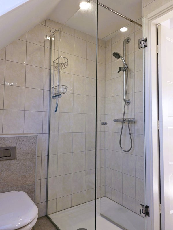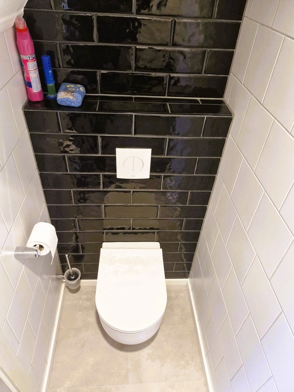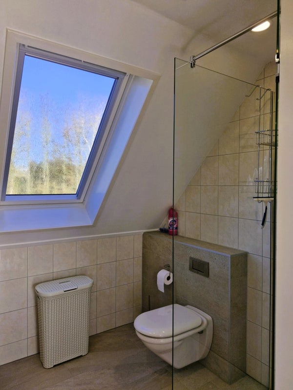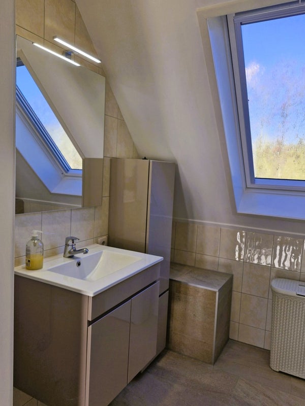 De nette badkamer is stijlvol afgewerkt en beschikt over een extra toilet, wat zorgt voor extra comfort in het dagelijks gebruik.