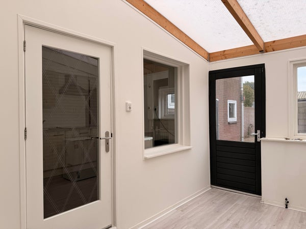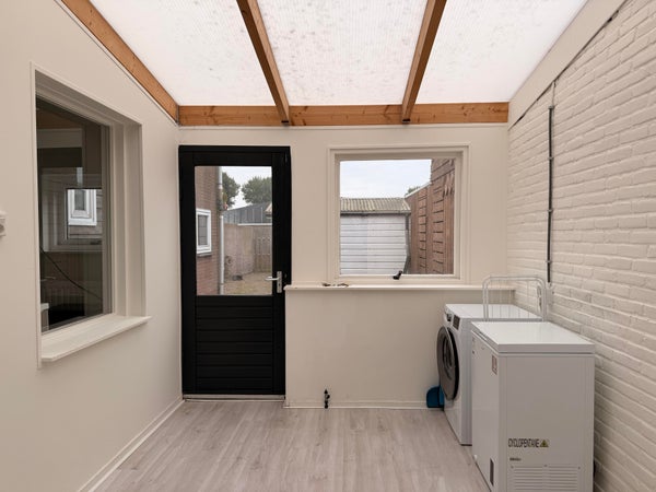De aanbouw is voorzien van extra vriesruimte en is dankzij de fijne lichtinval ideaal als knusse zitruimte of kantoorplek. Deze ruimte biedt tevens toegang tot de diepe achtertuin, gelegen op het zuidoosten — een heerlijke plek om van de zon te genieten.
