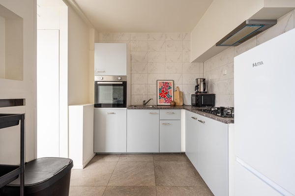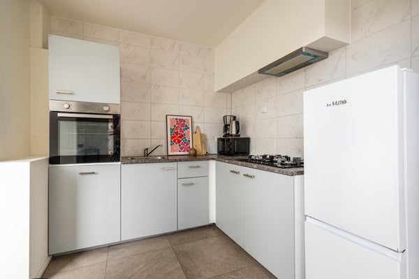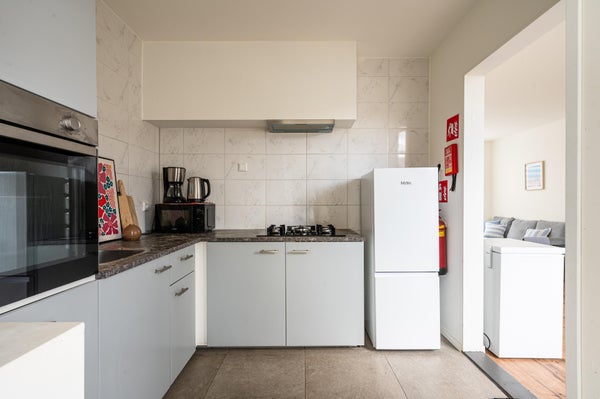 Keuken voor zien van onder andere oven, kookplaat, koelkast, vriezer, wasmachine en droger.