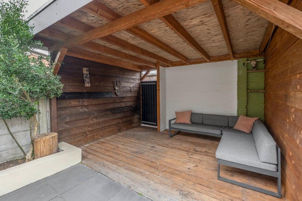 De tuin is netjes aangelegd en voorzien van een comfortabele loungeset, perfect om te ontspannen. Daarnaast is er een praktische schuur aanwezig voor extra opslagruimte.