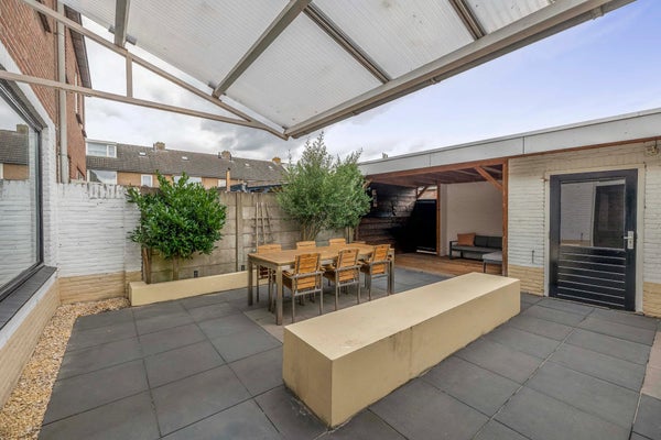 De tuin is netjes aangelegd en voorzien van een comfortabele loungeset, perfect om te ontspannen. Daarnaast is er een praktische schuur aanwezig voor extra opslagruimte.
