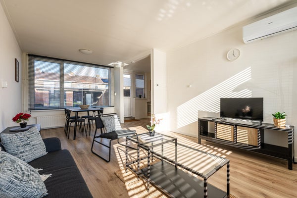 De woning heeft een woonoppervlakte van circa 90 m² en beschikt over drie slaapkamers. Daarnaast zijn er zowel een zonnige voortuin op het zuiden als een achtertuin op het noorden met berging, overkapping en achterom. Binnen tref je een lichte en ruime woonkamer met grote raampartijen, airco, nette laminaatvloer en toegang tot de achtertuin. De open keuken is volledig uitgerust met diverse inbouwapparatuur, waaronder een gaskookplaat, oven en koelkast.