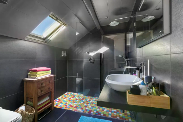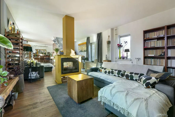 Bij binnenkomst bevindt u zich in de hal met een toilet en doorloop naar de woonkamer. Deze is op natuurlijke wijze opgesplitst door een sfeervolle haard: aan de ene kant is er plek voor een knusse leeshoek om te ontspannen met een boek, aan de andere kant een comfortabele zithoek met tv, perfect voor gezellige avonden.