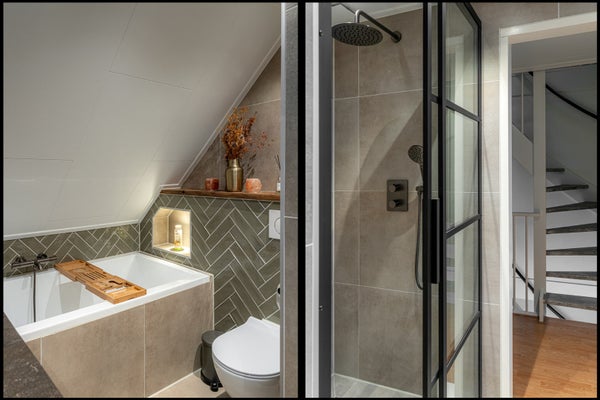Eerste verdieping: drie slaapkamers, luxe badkamer met tweede toilet, inloopdouche, wastafelmeubel en verwarmde spiegel.