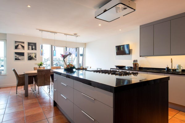 Deze prachtige woonkeuken voorzien van alle luxe. De keuken beschikt o.a. over een vaatwasser, 2x koelkast met vriesvak, afzuigunit, magnetron, grillplaat, riante fornuis inclusief kookpitten (gas) en oven. Deze keuken heeft een hoogwaardige afwerkingsgraad en ideale ruimte gezellige borrelavondjes te houden. In de keuken vind u ook een bergkast terug waar de wasmachine en droger gesitueerd zijn.