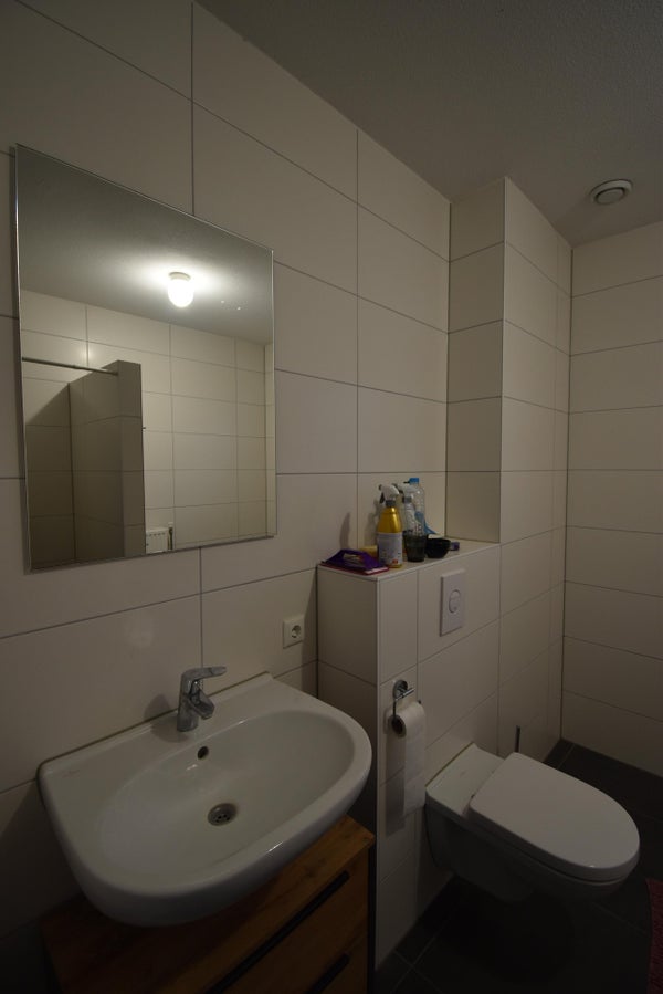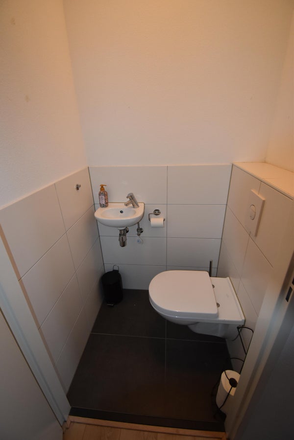 Entree, meterkast, toiletruimte voorzien van hangtoilet en fonteintje en toegang tot de woonkamer.