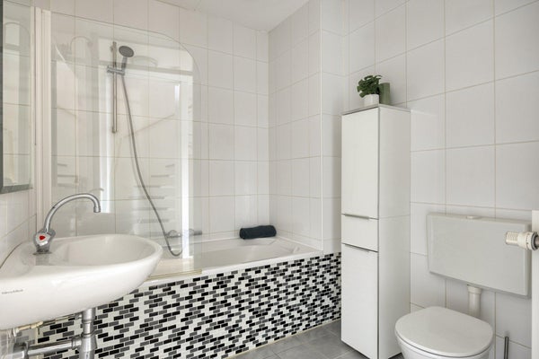 De badkamer is compleet uitgevoerd met een ligbad met douche, wastafel en een tweede toilet. De ruimte is volledig betegeld en functioneel ingericht.