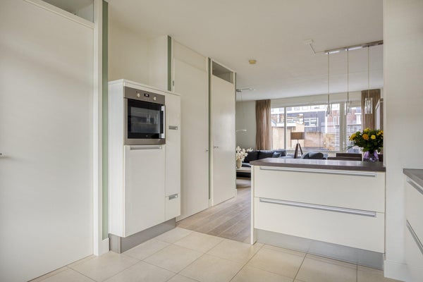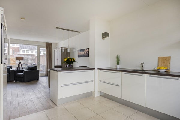 De keuken is ruim opgezet in hoekopstelling en voorzien van diverse inbouwapparatuur, waaronder een inductiekookplaat, afzuigkap, heteluchtoven, vaatwasser en koelkast. Het kunststof werkblad is praktisch in gebruik. Dankzij het raam met zonnescreen is er prettig daglicht en blijft de ruimte comfortabel in de zomer. De vloer is afgewerkt met lichte plavuizen.