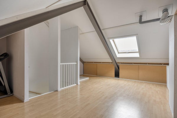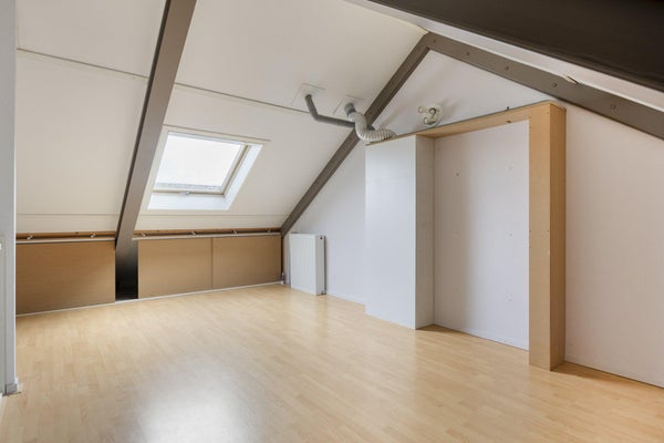 De zolderverdieping is een ruime, open etage met een Velux dakraam, aansluitingen voor de wasapparatuur en veel bergruimte. Deze verdieping leent zich uitstekend voor het realiseren van een extra slaapkamer, werkruimte of hobbyruimte.