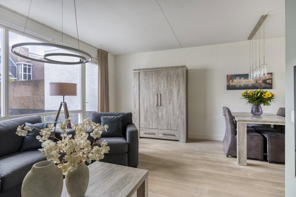 De woonkamer heeft een lichte en verzorgde uitstraling en biedt een prettige indeling met aan de voorzijde de keuken en aan de achterzijde de tuingerichte zitkamer. Hier zorgen de eikenhouten vloerdelen en de ligging aan de tuin voor een rustige sfeer. Onder de trap bevindt zich een praktische bergkast.