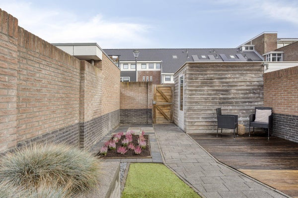 De achtertuin is circa 14 meter diep en ligt op het noordoosten, waardoor er gedurende de dag een prettige afwisseling is tussen zon en schaduw. De tuin beschikt over twee terrassen, een gazon en beplante borders. Achterin staat een houten berging met elektra en er is een achterom. Dankzij de diepte van de tuin behoort een uitbouw tot de mogelijkheden.