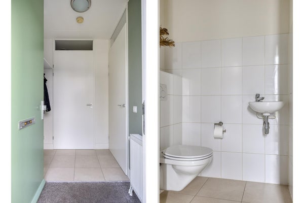 De toiletruimte is deels betegeld en voorzien van een hangend toilet en fonteintje.