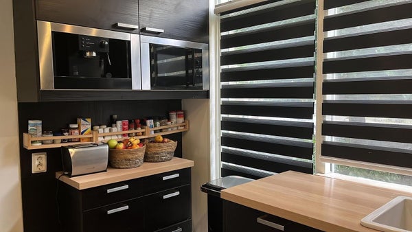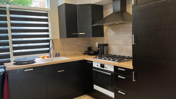 • Keuken: Moderne keuken met inbouwapparatuur, waaronder gaskookplaat, oven, vaatwasser, koelkast en veel bergruimte.