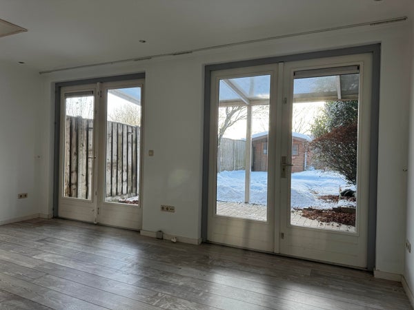 De woonkamer is aan de achterzijde uitgebouwd, waardoor er een royaal leefoppervlak is ontstaan. De kamer geniet veel lichtinval door de grote raampartijen en de dubbele openslaande deuren naar de achtertuin.