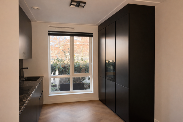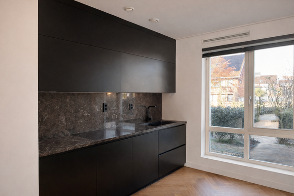 Aan de voorzijde bevindt zich de moderne open keuken, uitgevoerd in een strak design en voorzien van diverse inbouwapparatuur, waaronder een vaatwasser, ruime combi-oven, inductiekookplaat met geïntegreerde afzuiging en een royale koelkast met aparte vriezer.