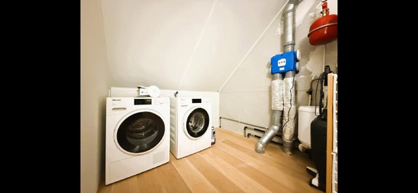 De tweede verdieping is bereikbaar via een vaste trap en biedt een derde, ruime slaapkamer en een aparte wasruimte met wasmachine en droger.