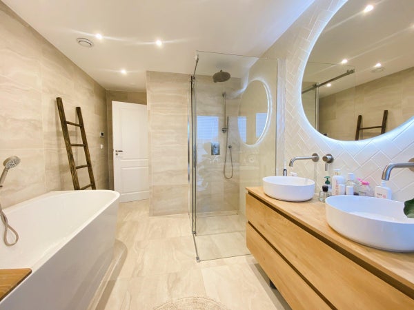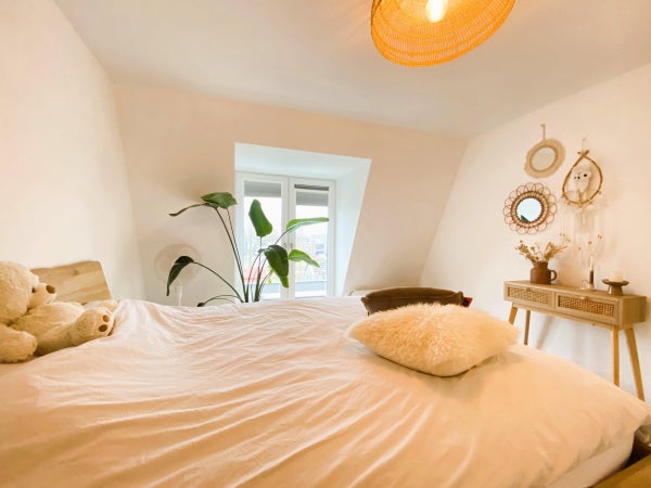 De woning beschikt over twee ruime slaapkamers, een separate study, een schitterende badkamer met zowel ligbad als inloopdouche, en twee aparte toiletten, beide voorzien van een fonteintje.