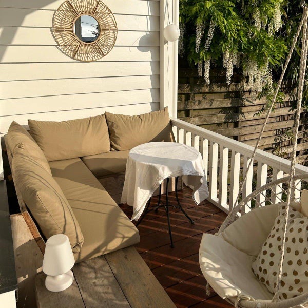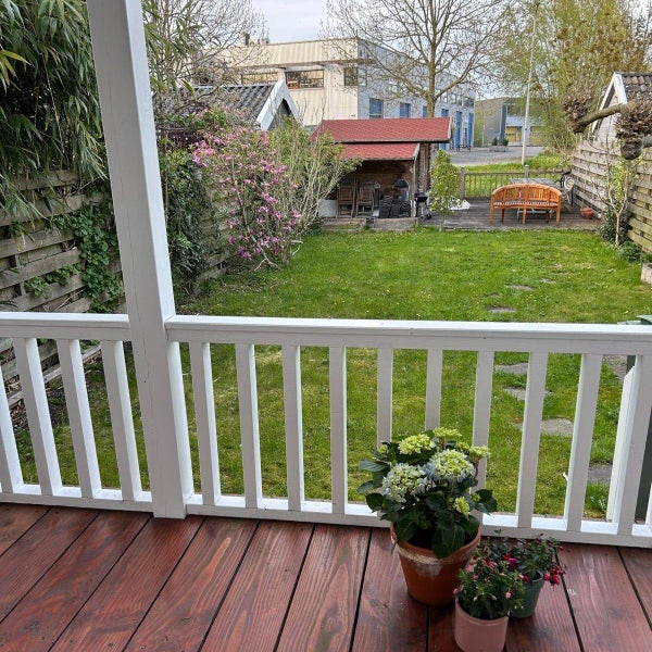 Aan de achterzijde ligt een charmante veranda, vanwaar u uitkijkt op de groene, diepe achtertuin — een heerlijke plek om in alle rust te genieten van het buitenleven.