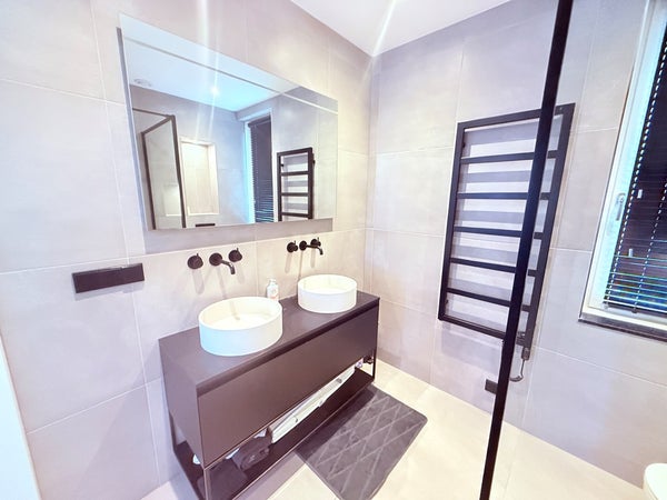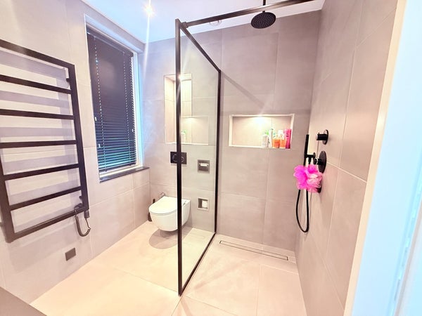 Moderne badkamer (wit/antraciet) met inloopdouche, wastafel, tweede toilet, handdoekradiator en opbergkast.