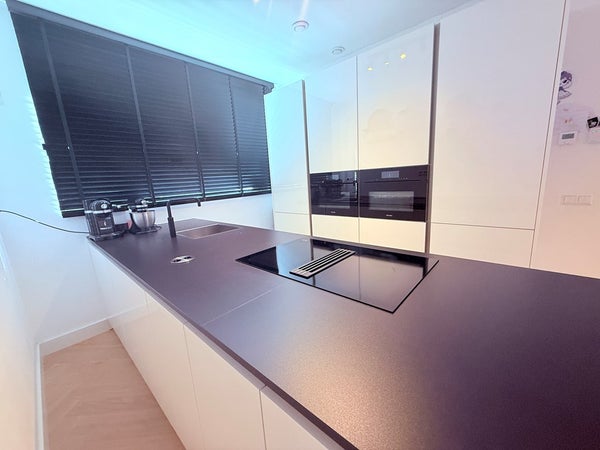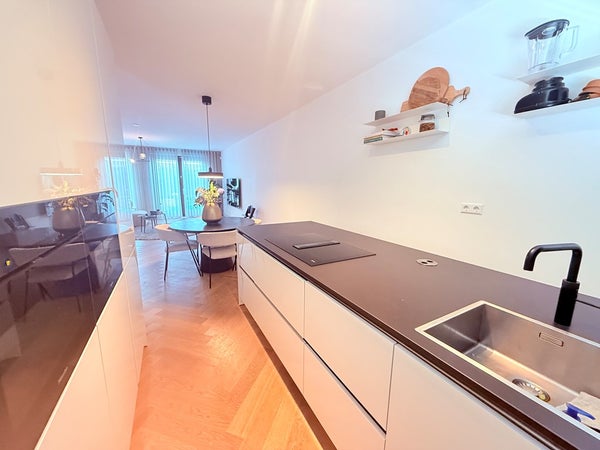 Open keuken aan de voorkant met inductiekookplaat, roestvrijstalen afzuigkap, oven, koelkast, vaatwasser en slimme ladeopslag.