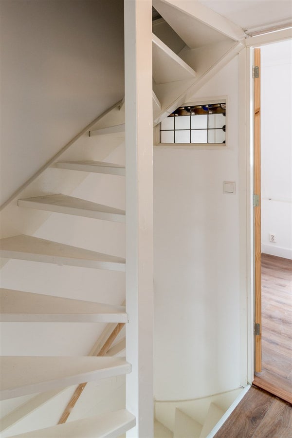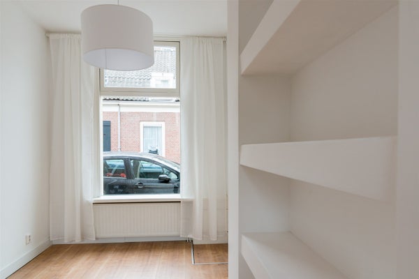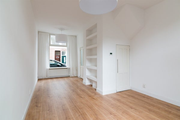 Begane grond, entree/hal met trapopgang. Ruime en lichte woonkamer met strak gestuukte wanden en hoge plafonds. De moderne open keuken bevindt zich aan de achterzijde van de woning en is voorzien van diverse inbouwapparatuur. In de woonkamer is een praktische, diepe, trapkast. Vanuit de keuken heeft u toegang tot het toilet en is er een deur naar de achtertuin.