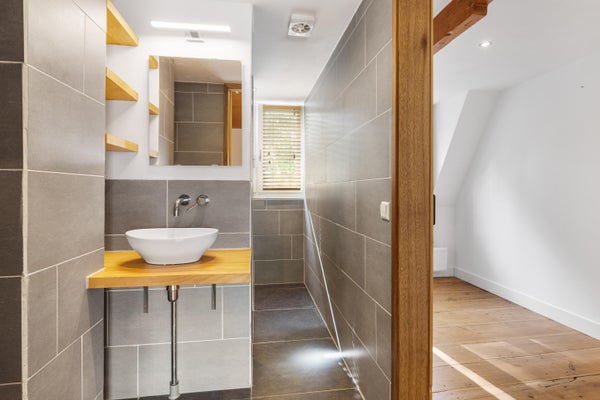 De badkamer is erg luxe en voorzien van een inloopdouche, tweede toilet en een waskom met een op maat gemaakt meubel met legplankjes.