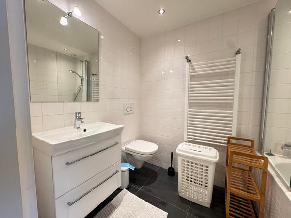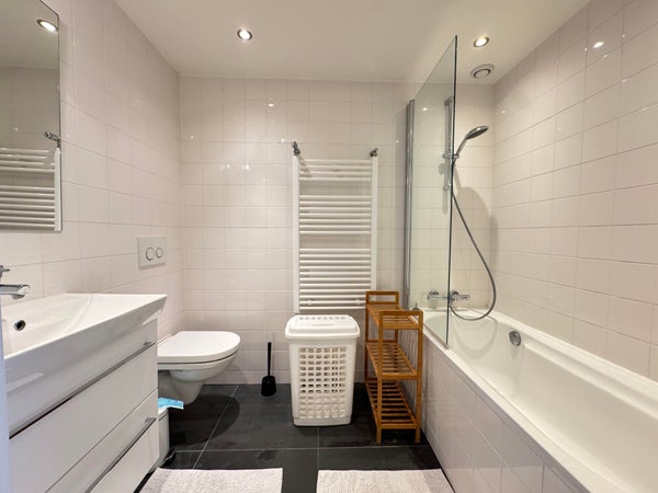 Twee slaapkamers, beide met een dubbel bed. Badkamer met douche in bad, wastafel en toilet.