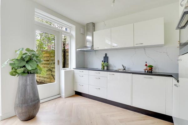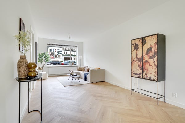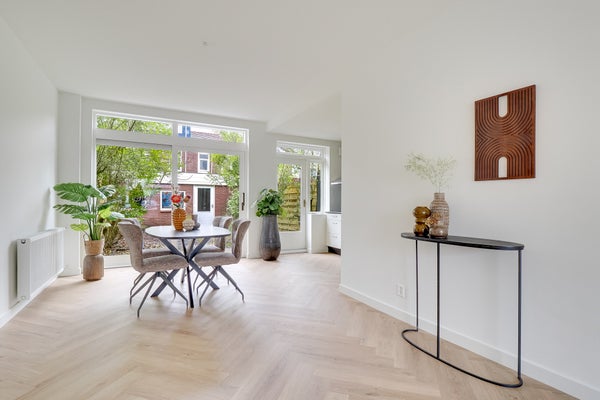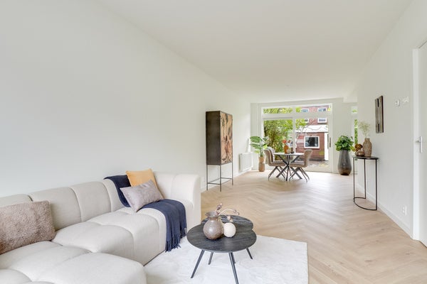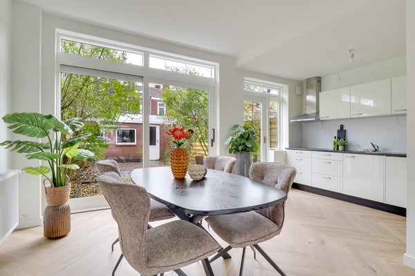 De woning is in 2025 volledig vernieuwd en combineert het karakter van de jaren ’20 met het comfort en de afwerking van nu. Denk aan een lichte doorzonwoonkamer met stijlvolle visgraatvloer, een moderne open keuken met hoogwaardige inbouwapparatuur en grote schuifpuien die zorgen voor een mooie verbinding tussen binnen en buiten. Authentieke elementen, zoals de openslaande deuren bij de entree en de zichtbare hanenbalken op de bovenste verdieping, geven het huis een warme en unieke uitstraling.